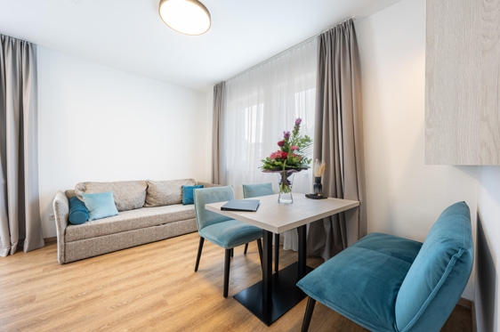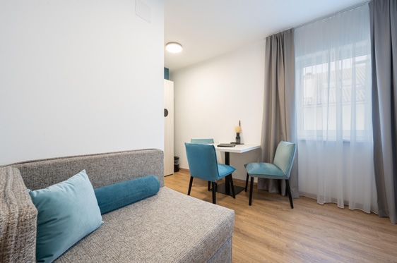 Familiekamer (2-4 personen): type Familien Suite, min. 36 m2 en voorzien van woon-/slaapkamer met 2-persoonssofabed, airco, zithoek, tv, WiFi, koelkast en kluisje. Aparte slaapkamer met 2-persoonsbed. Badkamer met douche, föhn en toilet.