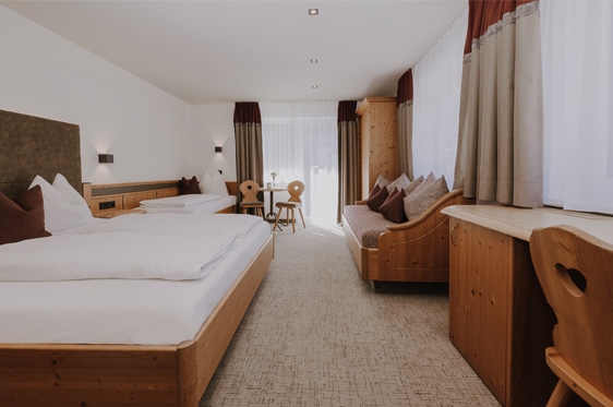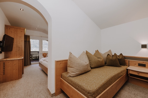 4-persoonskamer (3-4 personen): min. 27 m2 en voorzien van 2-persoonsbed, 1-persoonsbed, 1-persoonssofabed, zithoek, tv, WiFi, koelkast en kluisje. Badkamer met bad/douche, föhn en toilet. Deels met balkon.