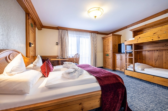 Familiesuite (3-4 personen): ca. 36 m2 en voorzien van woon-/slaapkamer met een stapelbed en een aparte slaapkamer met 2-persoonsbed (ruimtelijk gescheiden), tv, WiFi en kluisje. Badkamer met bad/douche, badjas en föhn. Apart toilet. Deels met balkon.