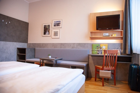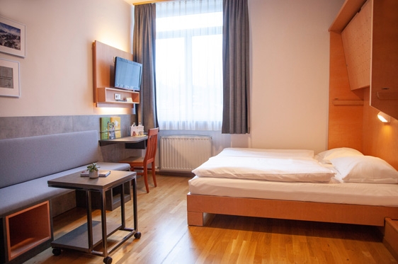 1-persoonskamer (1-1 persoon): min. 16 m2 en voorzien van 2-persoonsbed, tv, WiFi en kluisje. Badkamer met douche, föhn en toilet.