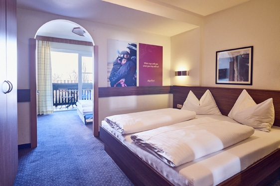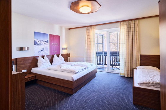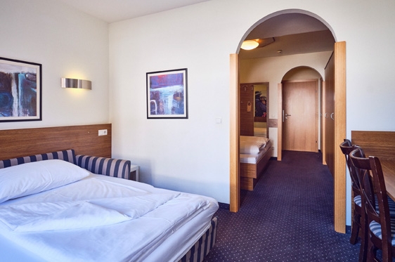 Familiekamer balkon (2-5 personen): min. 30 m2 en voorzien van 2-persoonsbed, extra bed, tv en WiFi. Aparte slaapkamer met 2-persoonsbed. Badkamer met douche en toilet. Balkon.