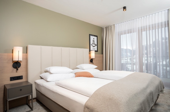 2-persoonskamer balkon (2-2 personen): min. 24 m2 en voorzien van 2-persoonsbed, tv, WiFi en kluisje. Badkamer met bad/douche, föhn en toilet. Balkon.