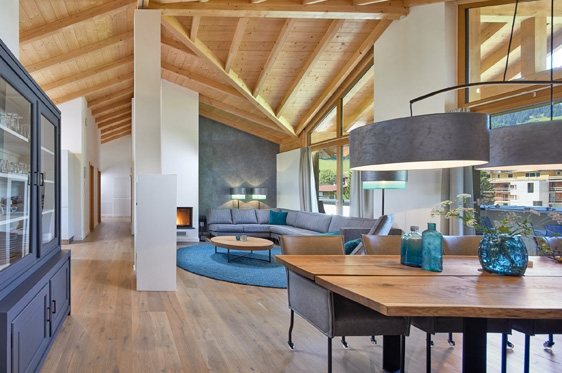Het gebouw kenmerkt zich door een traditionele, warme (veel hout) Oostenrijkse uitstraling van buiten, veel glas en prachtige, ruime terrassen en/of balkons en een modern, design-achtige look van binnen.