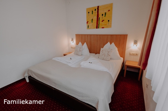 Familiekamer balkon (2-4 personen): min. 35 m2 en voorzien van slaapkamer met 2-persoonsbed, tv, WiFi en kluisje. Aparte slaapkamer met 2-persoonsbed. Badkamer met douche, föhn en toilet. Balkon.