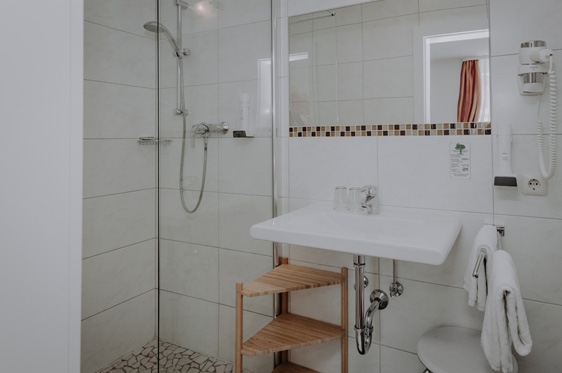3-persoonskamer balkon (2-3 personen): min. 23 m2 en voorzien van 2-persoonsbed, extra bed, tv, WiFi en kluisje. Badkamer met douche, föhn en toilet. Balkon.
